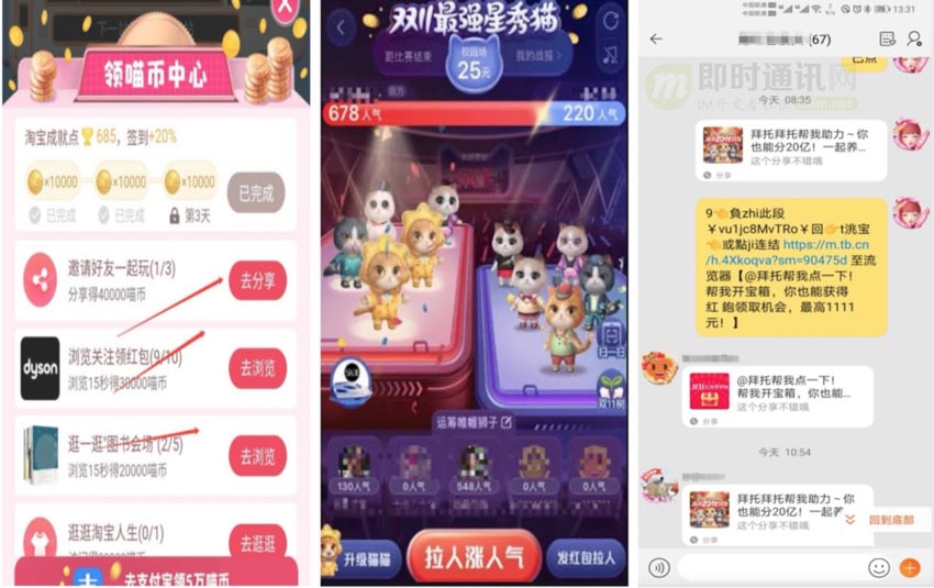 主互动玩法“超级星秀猫瓜分20亿红包”开启的时候,意味着大量互动拉赞、分享到好友、分享到群成为流量的入口,无论淘口令/图片等。