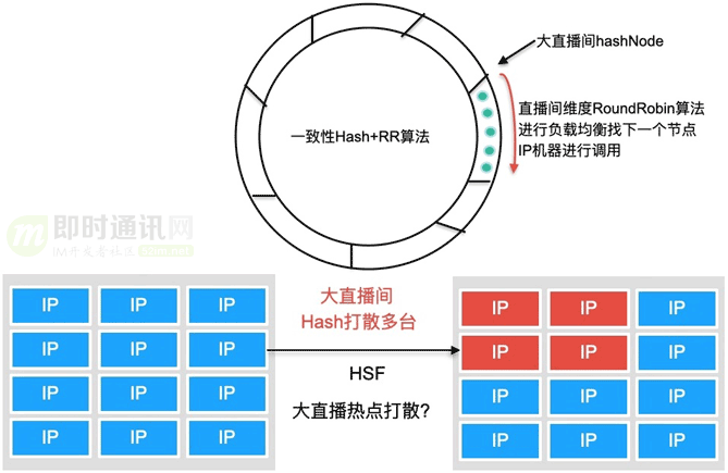 一致性Hash的架构必然存在热点问题,如果在直播间进行分散架构,必然存在指令风暴问题。基于此,需要进行Hash热点二次打散处理。