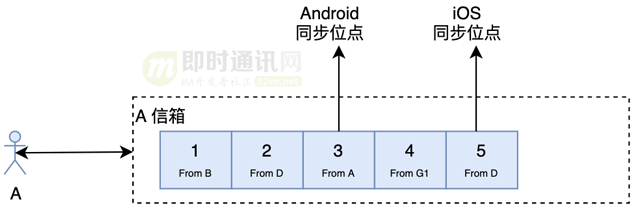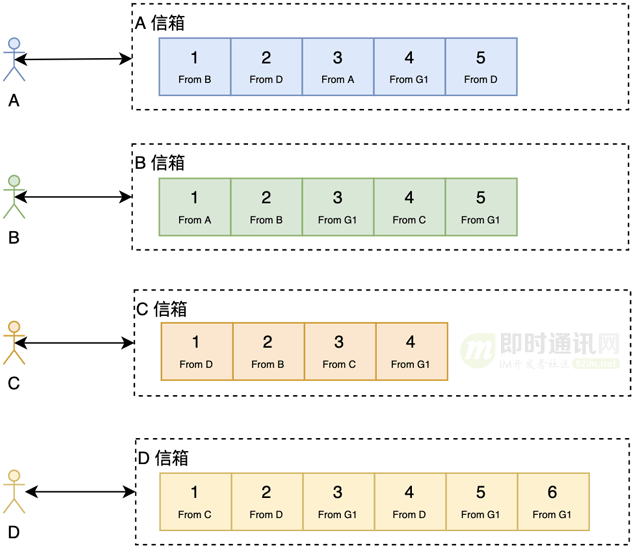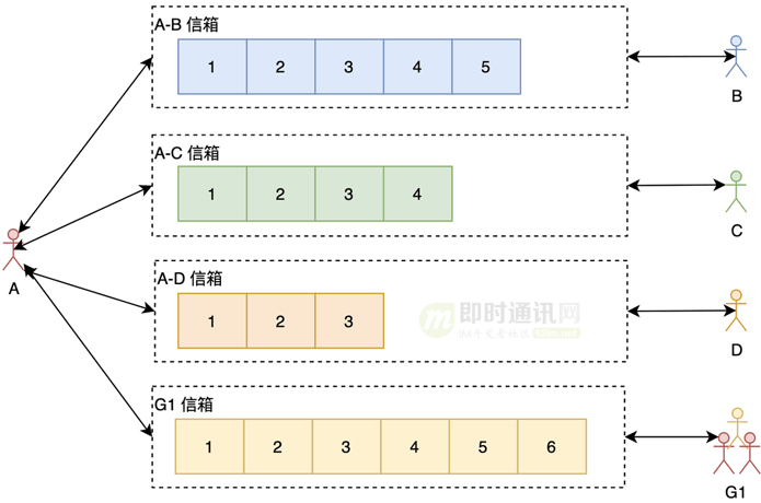 如上图所示:A与每个聊天的人跟群都有一个信箱(有些博文会叫Timeline,见《现代IM系统中聊天消息的同步和存储方案探讨》),A在查看聊天信息的时候需要读取所有有新消息的信箱。