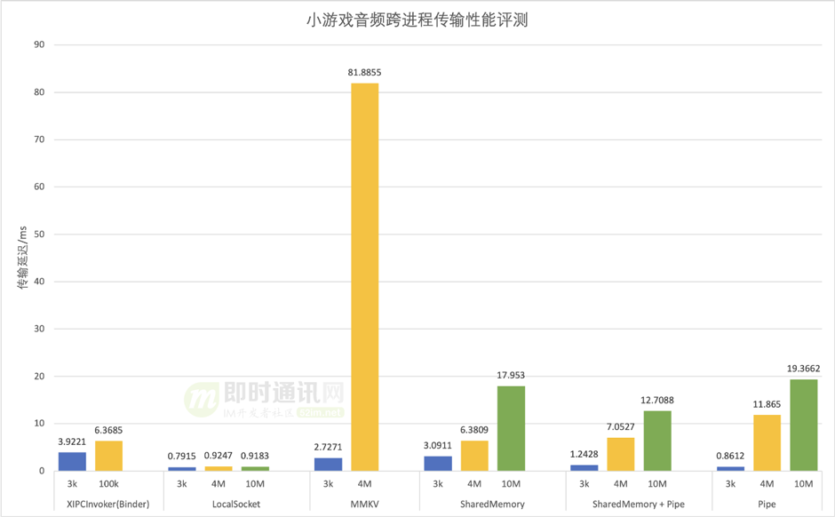 为了达到上述目标:我们对Binder、LocalSocket、MMKV、SharedMemory、Pipe这几种IPC方案进行了测试。在搭建的测试环境中,我们在小游戏进程模拟真实的音频传输的过程,每隔16毫秒发送一次序列化后的数据对象,数据对象大小分为3k/4M/10M三挡,在发送前储存时间戳在对象中;在主进程中接收到数据并完成反序列化为数据对象的时刻作为结束时间,计算传输延迟。
