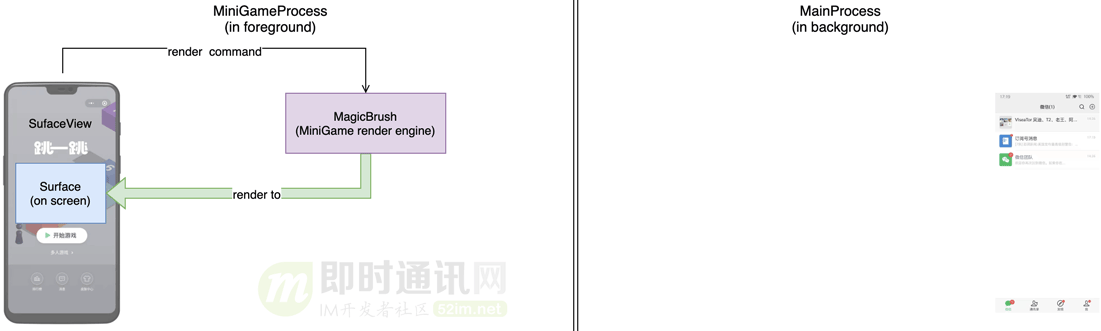 可以看到图中左半边表示在前台的小游戏进程,其中MagicBrush为小游戏渲染引擎,它接收来自于小游戏代码的渲染指令调用,将画面渲染到在屏的SurfaceView提供的Surface上。整个过程主进程在后台不参与。