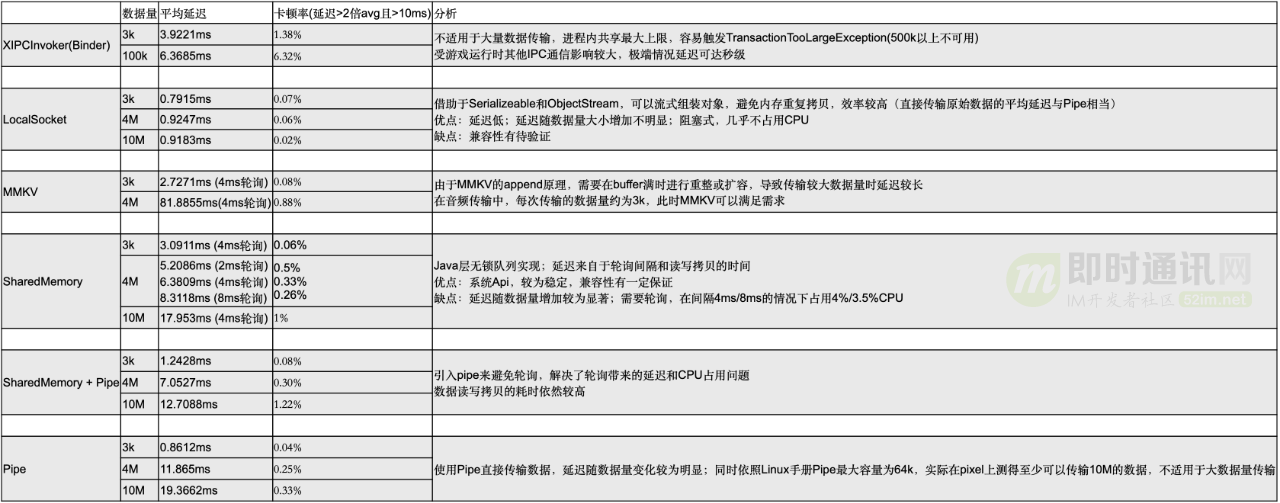 与一般的IPC跨进程通信用于方法调用不同:在这个场景下,我们需要频繁地(40毫秒一次)传输较大的数据块(16毫秒内的数据量在8k左右)。