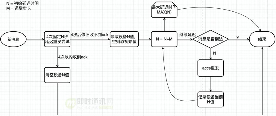 具体是:新消息先通过4次固定N秒的短延迟来探测设备的网络状况,一旦网络恢复,我们将设备的N值清空(设备N值是指根据上几次重发经验,当前设备网络能回复ACK所需要的最短时间,默认情况该值为空,代表用户设备网络正常)。4次重发后依旧收不到ACK,我们尝试读取设备N值,如果为空,则取初始值,以后每次延迟都递增固定步长M,并在重发后更新当前设备的N值,直到消息收到ACK或者达到了最大延迟时间MAX(N)。