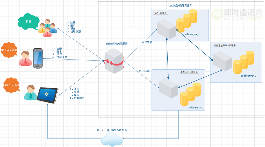 - 4)支持多端消息同步:app 端、web 端、微信公众号、小程序消息;