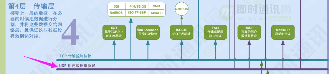 在OSI模型中,处在第四层——传输层,处于IP协议的上一层(见下图)。