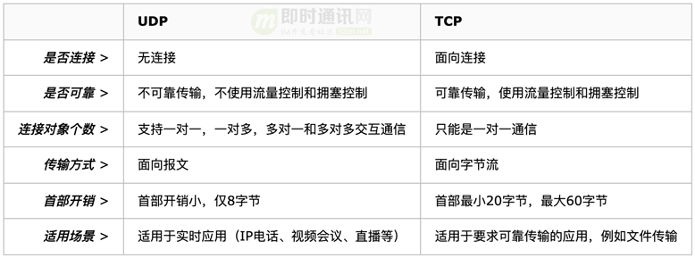 这样实现的弊端就是在网络条件不好的情况下可能会导致丢包,但是优点也很明显,在某些实时性要求高的场景(比如电话会议)就需要使用 UDP 而不是 TCP(见《网络编程懒人入门(五):快速理解为什么说UDP有时比TCP更有优势》)。