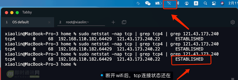 我做了个小实验:我用 ssh 终端连接了我的云服务器,然后我通过断开 wifi 的方式来模拟拔掉网线的场景,此时查看 TCP 连接的状态没有发生变化,还是处于 ESTABLISHED 状态(如下图所示)。