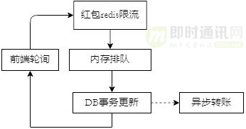 - 4)红包异步服务:主要承载红包异步任务,保证状态机的流转,包括红包的转账,红包的退款,以及红包补贴的状态推进;