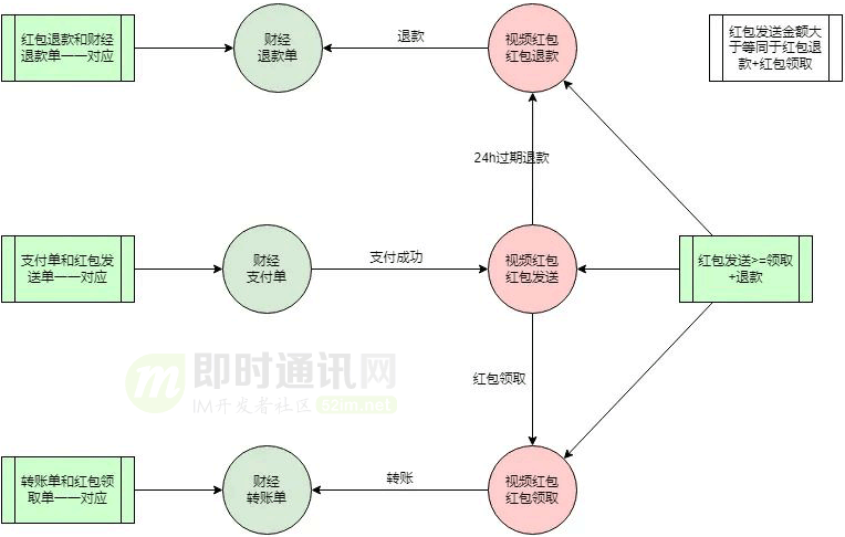同时:还需要保证用户的红包发放金额大于等于红包转账金额+红包退款金额,这里大于等于是因为红包从发放成功到退款成功整个周期会在 24h 以上。