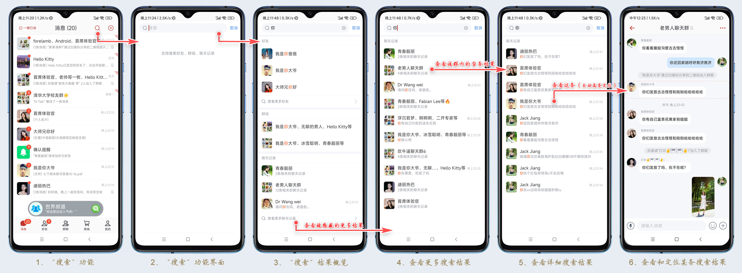 - 5)[新增]搜索功能(支持好友、群聊、聊天记录搜索(与微信逻辑一样));