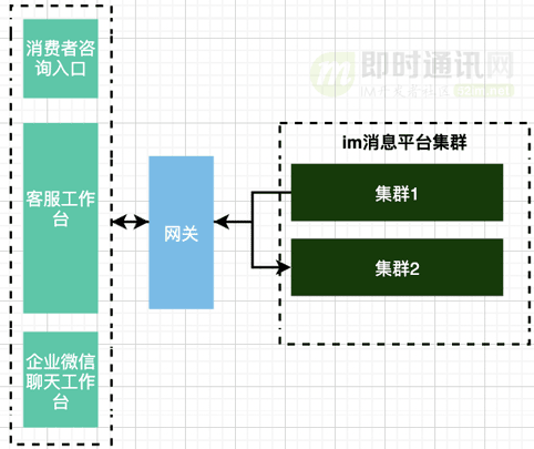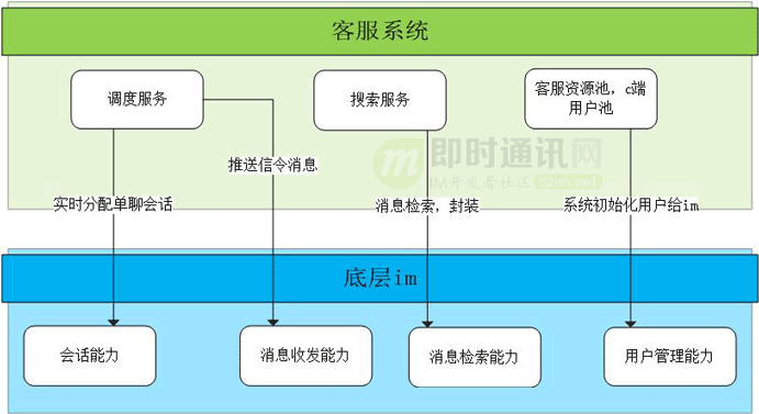客服系统内部需要根据im的底层支持能力进行相应的业务封装以及客服系统的客服用户池,c端用户池如何初始化到im的用户中心这些问题都是需要考虑进去的。