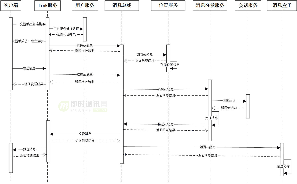 当两个处于不同IM实例的客户端A和B聊天时,A用户发送消息到link --> 消息总线 --> 消息分发服务 --> 消息总线 --> link --> B用户。