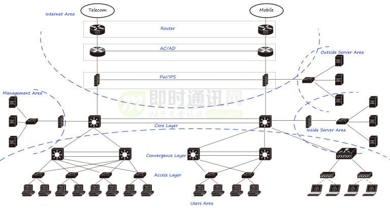 安全管理区:通过防火墙安全访问,通过审计、日志、入侵检测、网络管理等产品对整个网络进行管理。