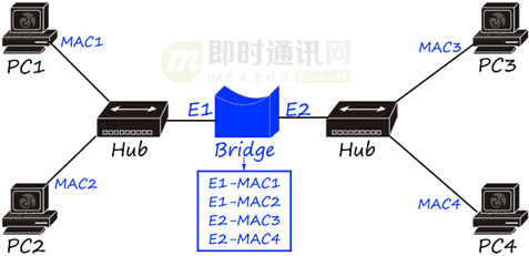 而网桥除了可以扩展网络的物理连接范围外,还可以对 MAC 地址进行分区,隔离不同物理网段之间的碰撞(也就是隔离 “冲突域”)。