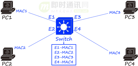 交换机可以记录该终端主机的 MAC 地址,并生成一个 MAC 表。MAC 表相当于一个 “map”,交换机根据 MAC 表在主机之间转发数据流。