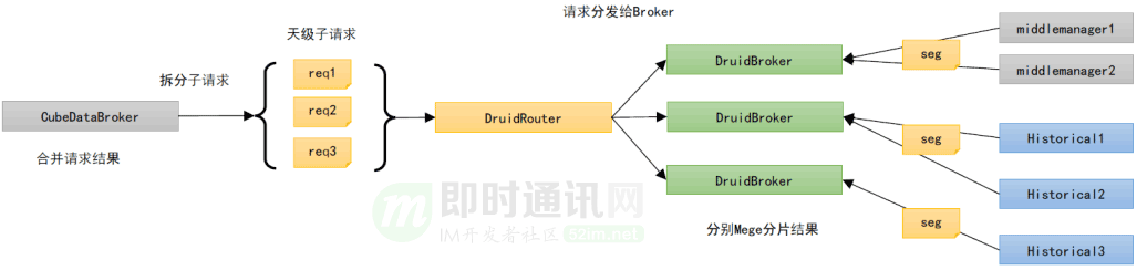在这个方案中,每个查询都会被拆解为更细粒度的“子查询”请求。例如连续查询 7 天的时间序列,会被自动拆解为 7 个 1天的时间序列查询,分发到多个 Broker,此时可以利用多个 Broker 来进行并发查询,减少单个 Broker 的查询负载,提升整体性能。