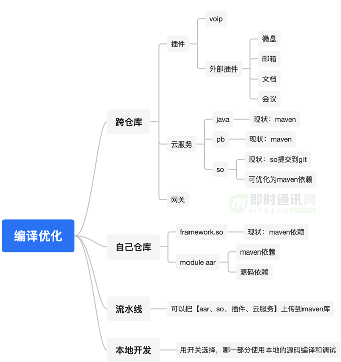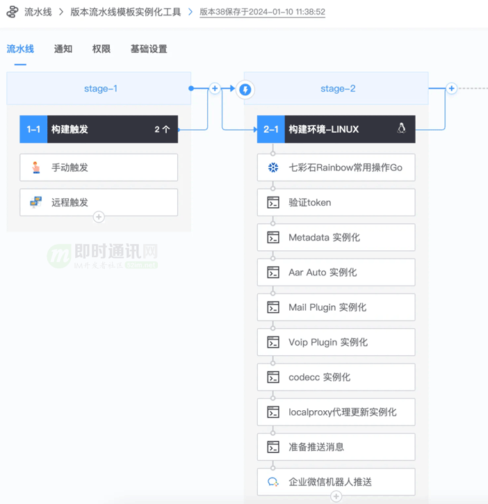 不同的组件由不同团队维护的流水线构建,最后以maven的形式集成到本地版企业微信APP中。当分支管理工具拉出一条新分支时,就会自动实例化各个业务组件的子流水线。这样我们可以做到即使在多团队、多仓库、多分支开发的情况下,组件编译和集成编译都可以全自动进行。