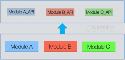 组件间的通信方案使用接口,即每个模块各自提供一批对外的api接口,其它模块只能访问到这些api,如下图所示。