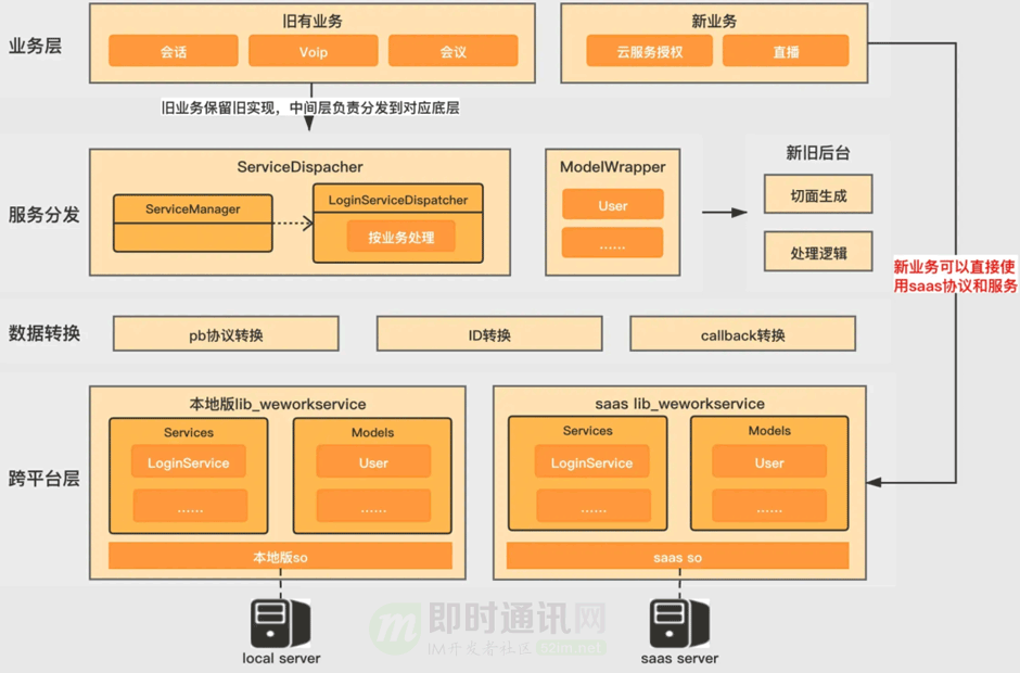 我们针对分层不够清晰的问题,重构了一套严格编译隔离的云服务底层:业务层调用者必须通过中间分发层调用本地版服务或者云服务,无法绕过中间层。
