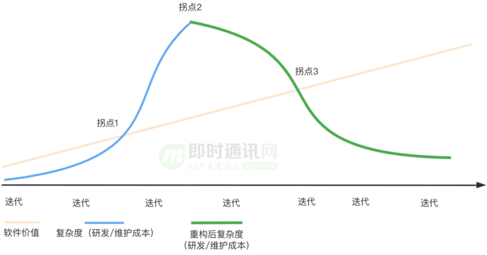 如果我们只注重业务上的价值而忽略了软件的研发维护成本,那么长此以往就会来到拐点 1。当研发维护成本超出业务价值,收益就开始负增长了。很多企业往往也是到这个拐点才意识到重构的重要性。