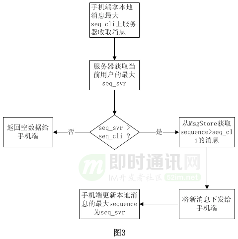当服务器和手机端都拥有了一个 sequence 之后,服务器和手机端之间就可以根据两者 sequence 的差异来收取消息,同时保证手机端未收取下去的消息最终能够收取下去。