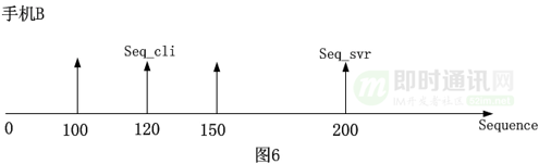 如上图5所示:手机 A 在下一次再次上来服务器收取消息,此时 Seq_cli = 150,服务器的 Seq_svr = 200,那手机 A 可以将 sequence为[151 - 200]的消息收取下去。