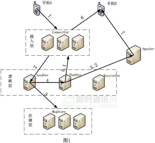 - 1)1 - 手机A发送发消息请求到接入层 ConnnectSvr;