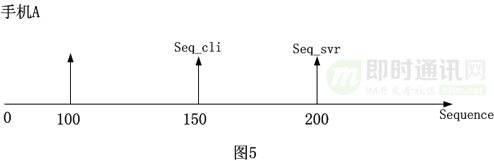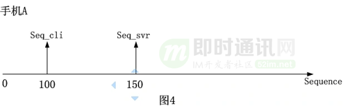 如上图4所示:假如手机 A 拿 Seq_cli = 100 上服务器收取消息,此时服务器的 Seq_svr = 150,那手机 A 可以将 sequence 为[101 - 150]的消息收取下去,同时手机 A 会将本地的 Seq_cli 置为150。