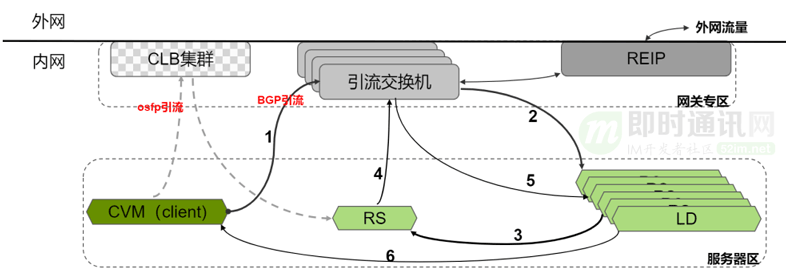 另外:这里的CLB服务器,可以跟其他的网关包括母机复用一些相同机型的服务器,当需要扩容时,就可以使用通用服务器。而不像以前CLB既有自己独立的机型,又对服务器的物理位置有要求。有了引流交换机跟LD之间是做隧道传输,LD具体的物理位置就没有像原来一样有硬性的要求。这样CLB可以通过通用服务器区域,调配服务器。