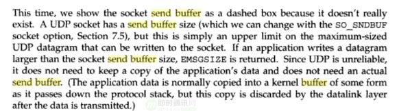 UDP 中的 send buffer 是用虚线框圈起来的,具体的叙述我直接引用书中原文: