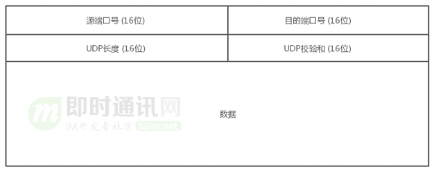 每个 UDP 报文分为 UDP 报头和 UDP 数据区两部分。报头由 4 个 16 位长(2 字节)字段组成,分别说明该报文的源端口、目的端口、报文长度和校验值。