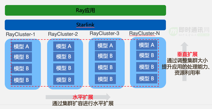 为了提升 Ray 应用的扩展能力,我们通过starlink实现了Ray联邦集群架构,每个Ray应用可以拥有多个Ray集群,单个Ray集群都拥有完整的功能。用户可以调整单个Ray集群的大小,在单个Ray集群内进行Actor的资源分配,提升应用处理能力,提升资源利用率,实现垂直扩展能力;可以通过扩容Ray 集群数量,实现水平扩展。