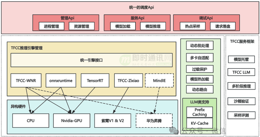 我们基于TFCC框架提供标准服务框架,统一了接入模式,透明化了引擎实现,算法仅需声明模型,不再需要手写推理代码,同时内化异构卡型适配工作,屏蔽硬件细节,在应用层实现一份代码、多处推理,支持灵活多样的AI应用场景。
