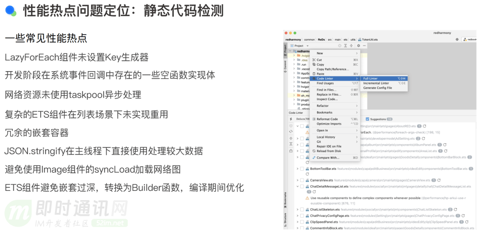 在小红书的开发过程中,我们遇到了一些性能热点问题,这些问题大多是通过 Code Linter(代码检查工具)检测出来的。由于开发节奏快,开发者在编写代码时可能难以关注到性能问题,因此需要 CI(持续集成)检查工具来辅助检查。