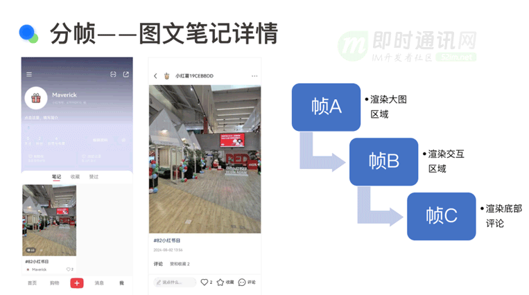 在小红书的图文笔记场景中,分帧方案得到了应用。当用户在首页的双列场景中点击一篇笔记进入笔记详情页时,这个过程涉及到许多组件的加载。我们可以将这些组件拆分成不同的帧,例如帧 a、帧 b 和帧 c。对于用户而言,他们通常希望在第一时间看到整个大屏的画面,因此我们会优先在帧 a 中展示大图。而在帧 b 和帧 c 中,我们再处理顶部导航栏或底部交互区等内容。通过这种分帧策略,我们能够确保用户在第一时间看到最关键的内容,同时避免了因为一次性加载过多组件而导致的性能问题。