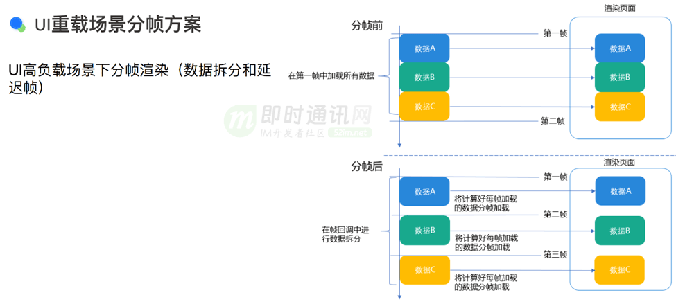 在处理 UI 重载场景时,我们采用了一种称为分帧方案的方法。分帧这个术语的含义是,当应用在一帧内无法完成所有绘制工作,或者在多帧内都无法完成时,会导致屏幕卡顿现象。尽管用户可以看到画面,但却无法进行滑动或操作。在这种情况下,分帧方案就显得尤为合适。虽然分帧方案可能看起来不是最优雅的解决办法,但它确实能够有效地解决性能问题,使应用性能达到预期标准。分帧方案虽然看似是一种应急措施,但它能够帮助应用性能达标。