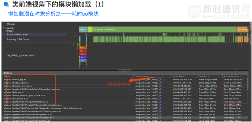 我们通过特定的分析工具对懒加载进行了深入分析。如图所示,我们能够识别出启动过程中加载的各种模块,包括 RNOH(React Native on Harmony)、Web engine(网页引擎)、Red Player(播放器)等组件。这些模块的加载过程涉及到多个.so 文件,即共享对象文件。