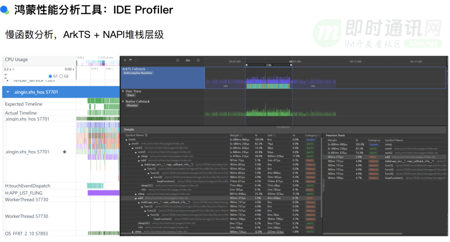 除了主观工具,我们还可以使用 IDE 提供的性能分析工具,如 Profiler,来分析慢函数。由于 ArkTS 编程语言框架主要通过 RTS 和 NAPI(原生应用接口)进行关联,因此需要能够查看 ArkTS 和 NAPI 的整个堆栈层级。这与安卓有所不同,因为当 Java 通过 Java Native API 与原生代码交互时,堆栈并不那么容易查看。