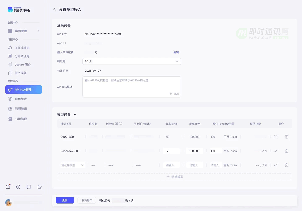 在 API Key 的认证基础上还提供细粒度的权限控制功能,允许为每个 API Key 配置可访问的模型范围,以及对不同模型的设置不同的配额。