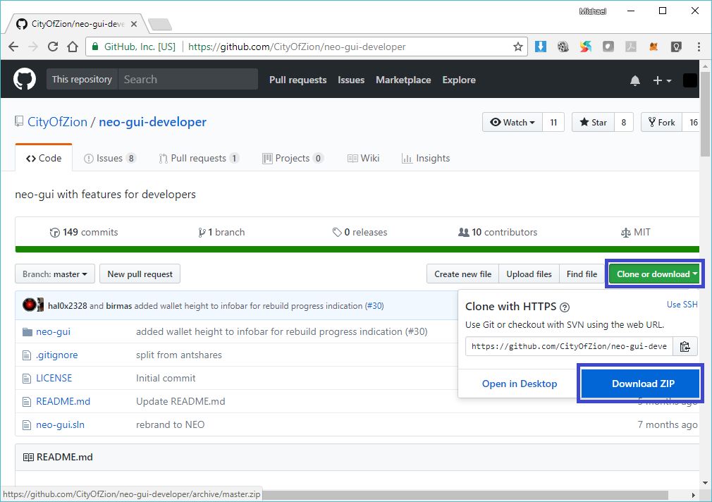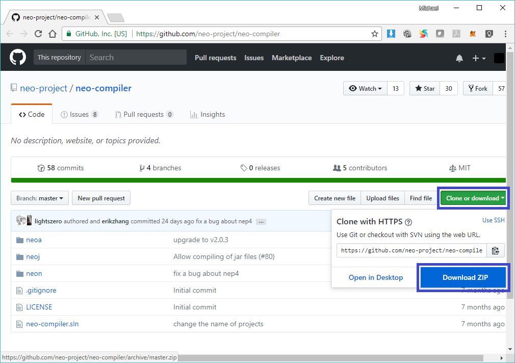 2.单击克隆或下载,然后选择下载ZIP,将当前版本项目源代码的存档下载到本地NEO文件夹(即C:\ NEO或在activity 0 中- 先决条件和推荐中创建的备用文件夹)。