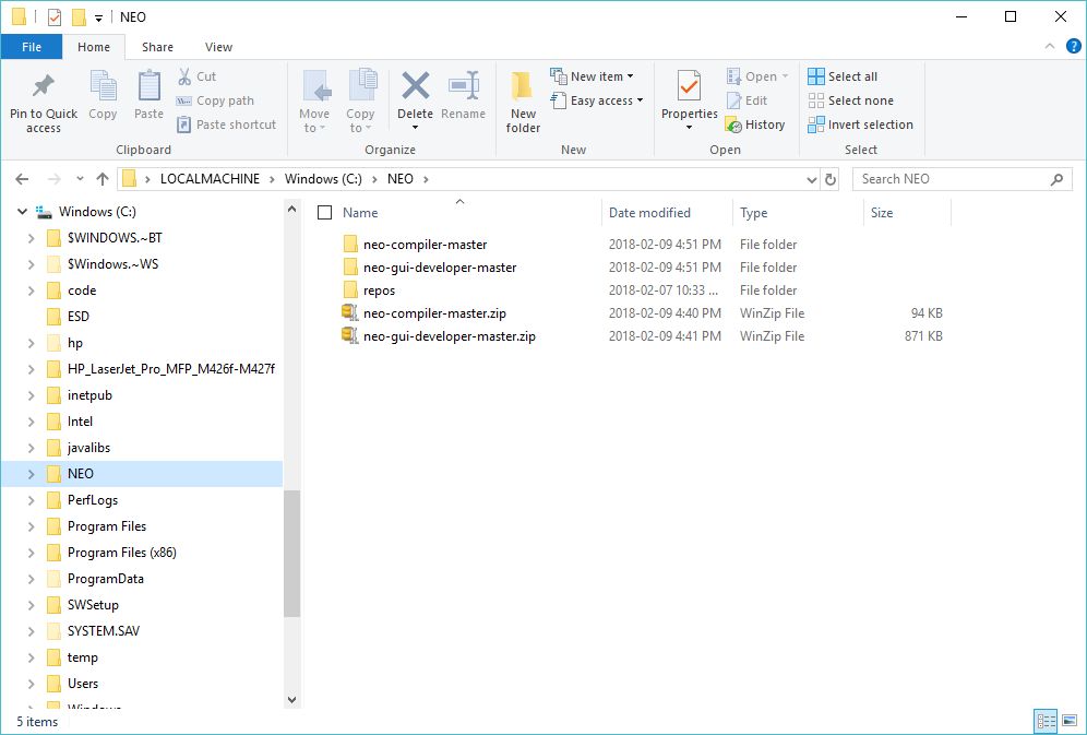6. 解压缩存档文件以将源文件保存到子文件夹中(例如,默认情况下为C:\ NEO \ neo-gui-developer-master)。