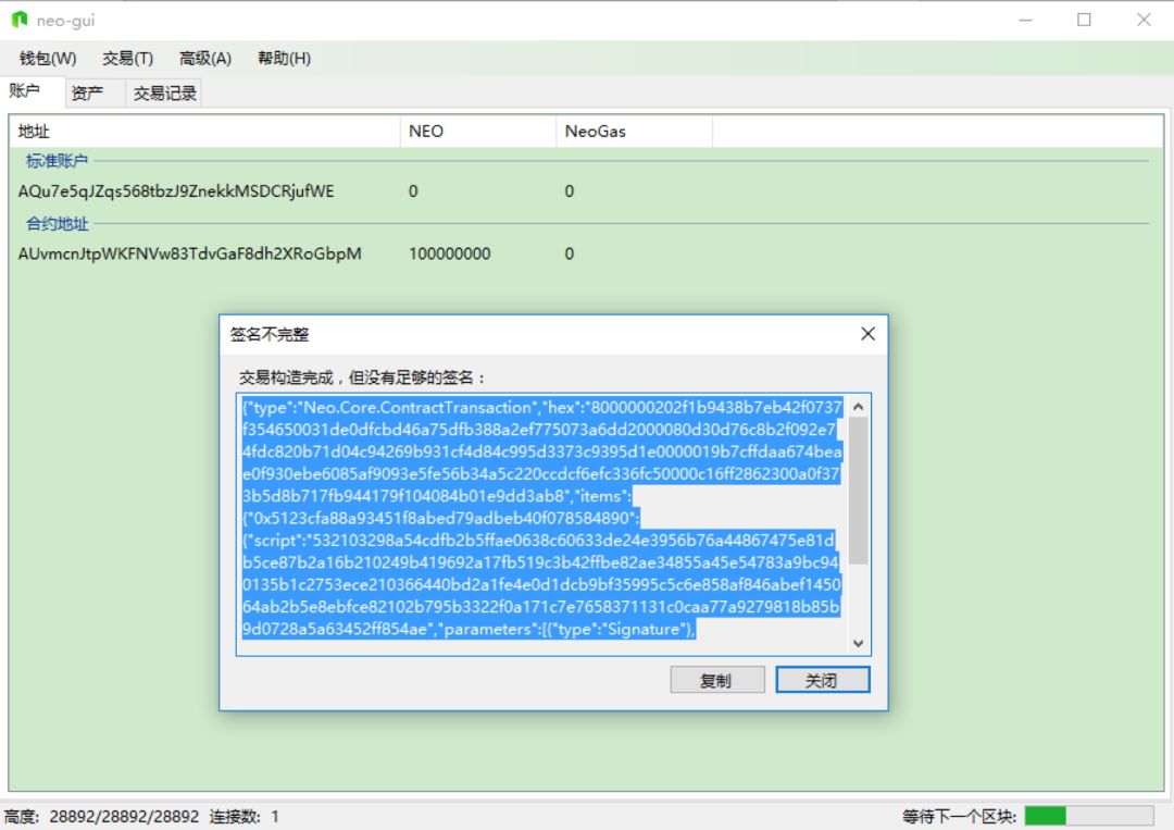第7步,从记账人多重签名合约中取出初始块中的1亿Neo转到一个非记账人钱包中