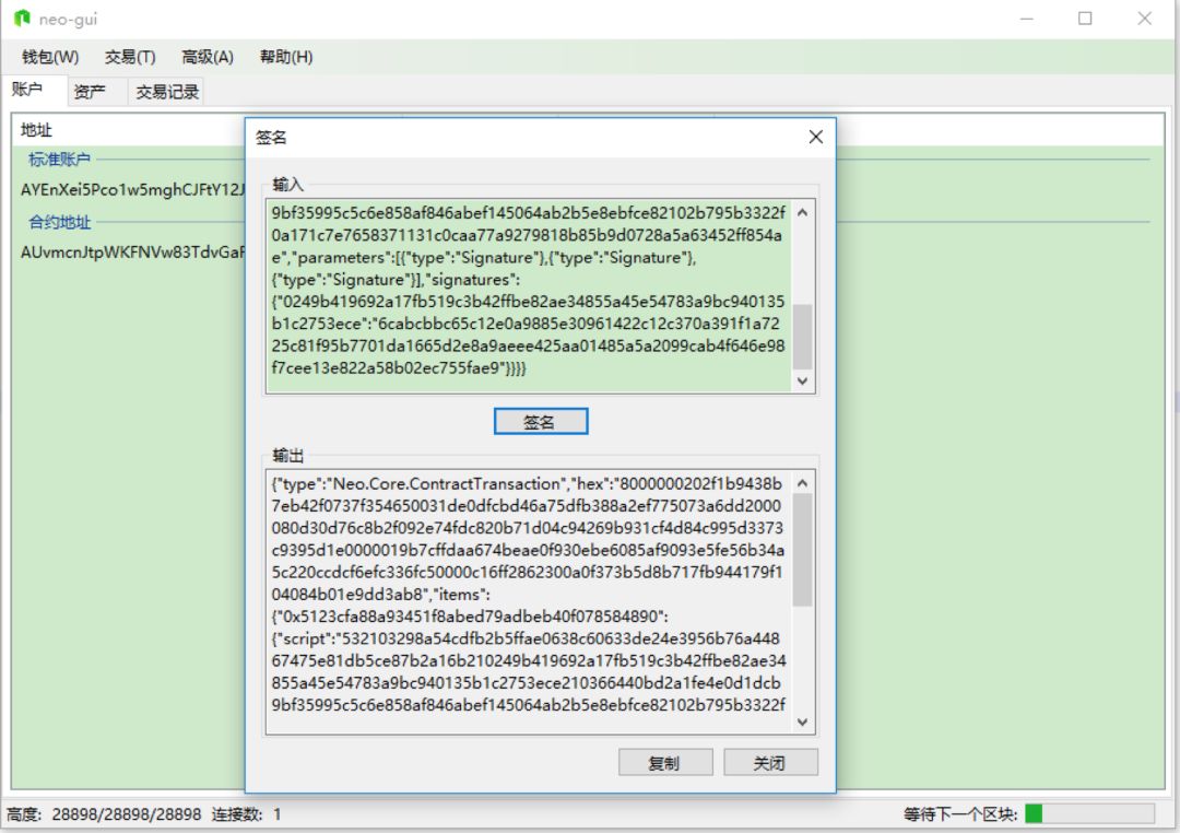 没事,我们先把整个内容复制出来,然后打开1号记账人钱包,【交易】-【签名】对这笔转账交易进行第二人签名。