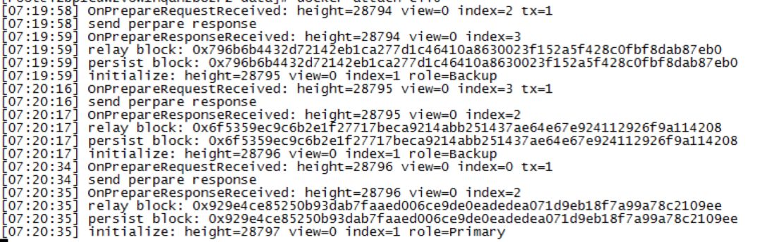 最后一个节点启动后,稍等片刻,可以看到私链已近开始运行: