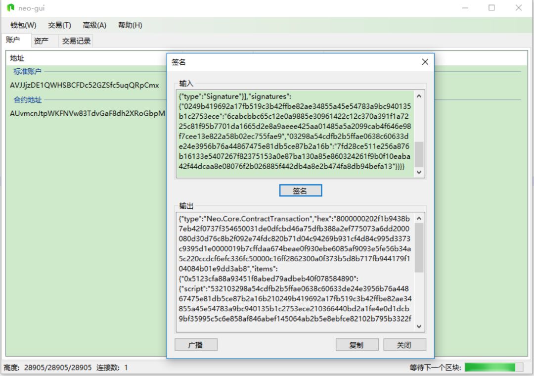 此时,左下角出现【广播】按钮,代表交易签名已经完备。