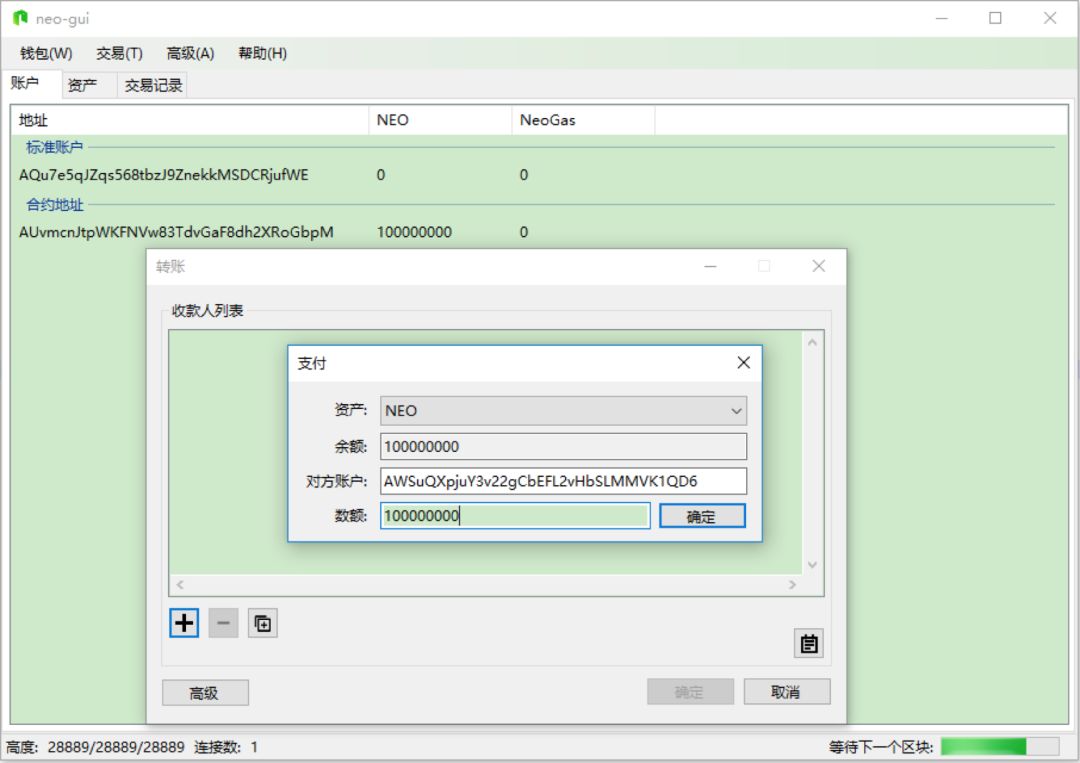 等到15秒左右,1亿Neo就到你建立的那个AWSuQXpjuY3v22gCbEFL2vHbSLMMVK1QD6地址中了。