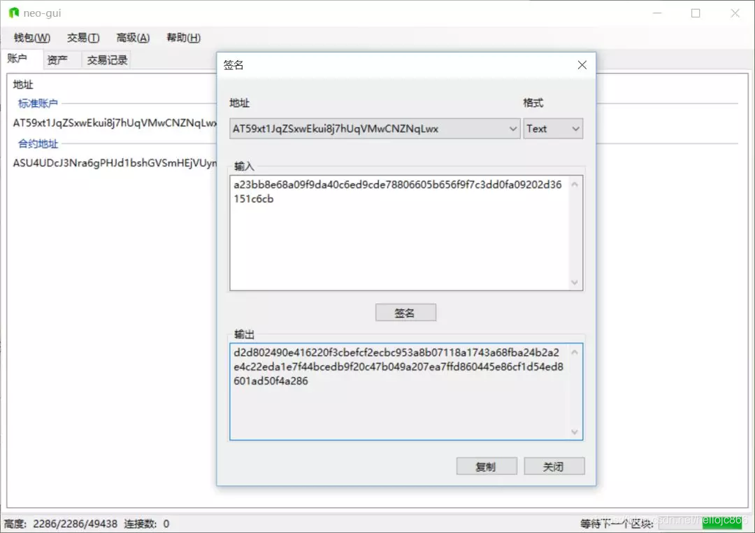 ⑤在“地址”中选择候选人公钥对应的账户地址,在“输入”框中填入之前生成的字符串,点击“签名”。 “输出”框中显示出对应的签名,将其复制。