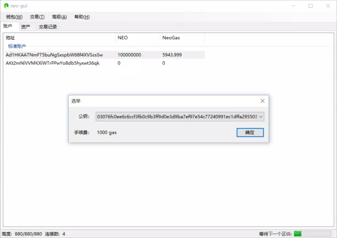 ③选取该地址公钥,点击 确定。注意此操作将花费 1000 GAS。完成后会显示交易构造成功提示以及交易ID。