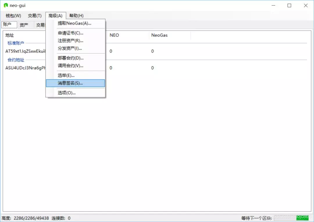 ④在 NEO-GUI 客户端中,点击“高级”-> “消息签名”。