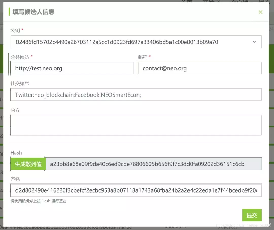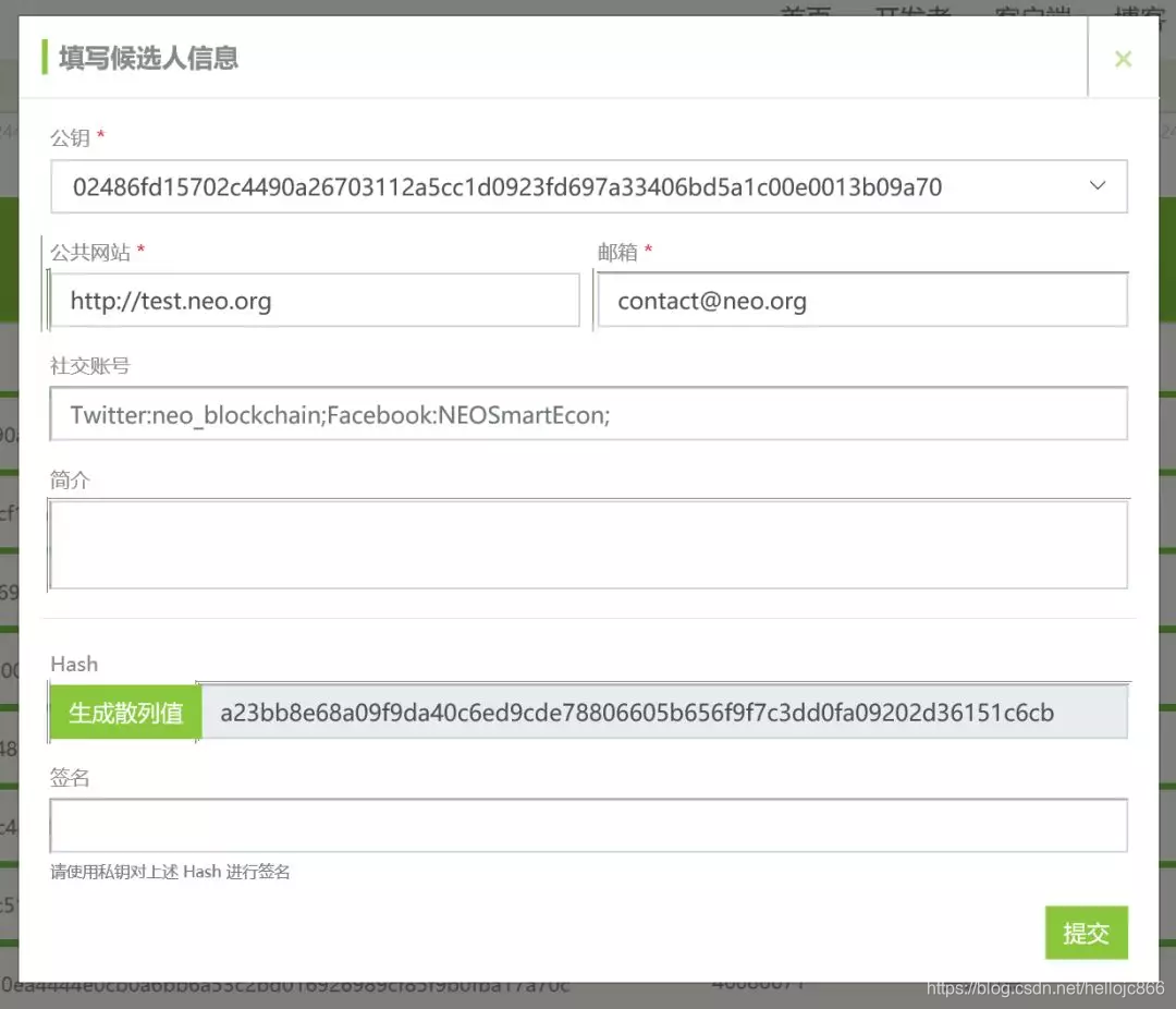 ⑥回到填写候选人信息框,将获取到的签名填入,并点击“提交”